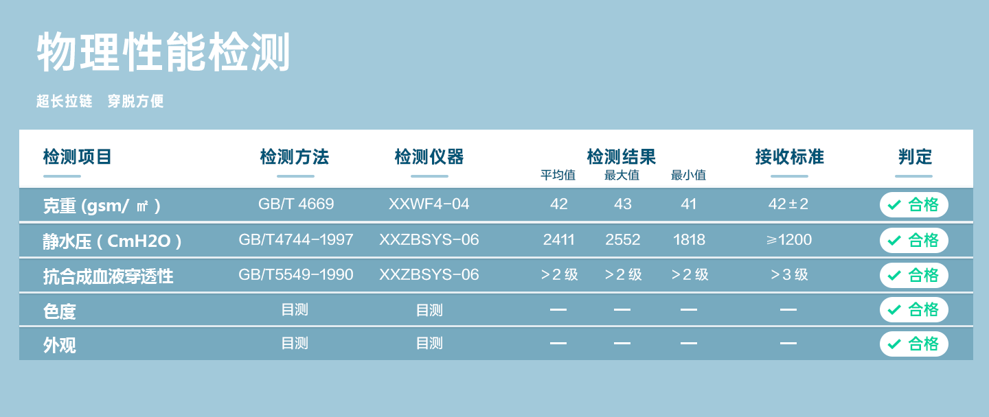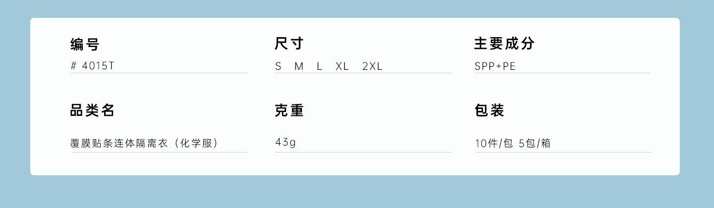 規(guī)格尺寸:S~2XL 主要成分:聚丙烯+聚乙烯 克重:43g 工藝:聚丙烯+聚乙烯 包裝:10件/包 5包/箱