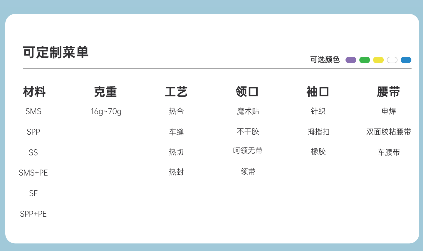 規(guī)格尺寸:S~2XL 主要成分:聚丙烯 克重:36g-90g 顏色:白色、黃色、藍(lán)色 工藝:熱合、針織袖口領(lǐng)口魔術(shù)貼、點(diǎn)焊腰帶 包裝:10件/包 10包/箱