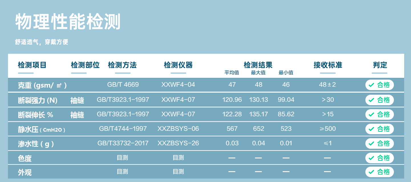 規(guī)格尺寸:S~2XL 主要成分:聚丙烯 克重:25g-50g 顏色:白色、藍(lán)色、深藍(lán)、淺藍(lán)、紫色 工藝:車縫、針織領(lǐng)口、袖口、5扣、三口袋 包裝:10件/袋 10袋/箱