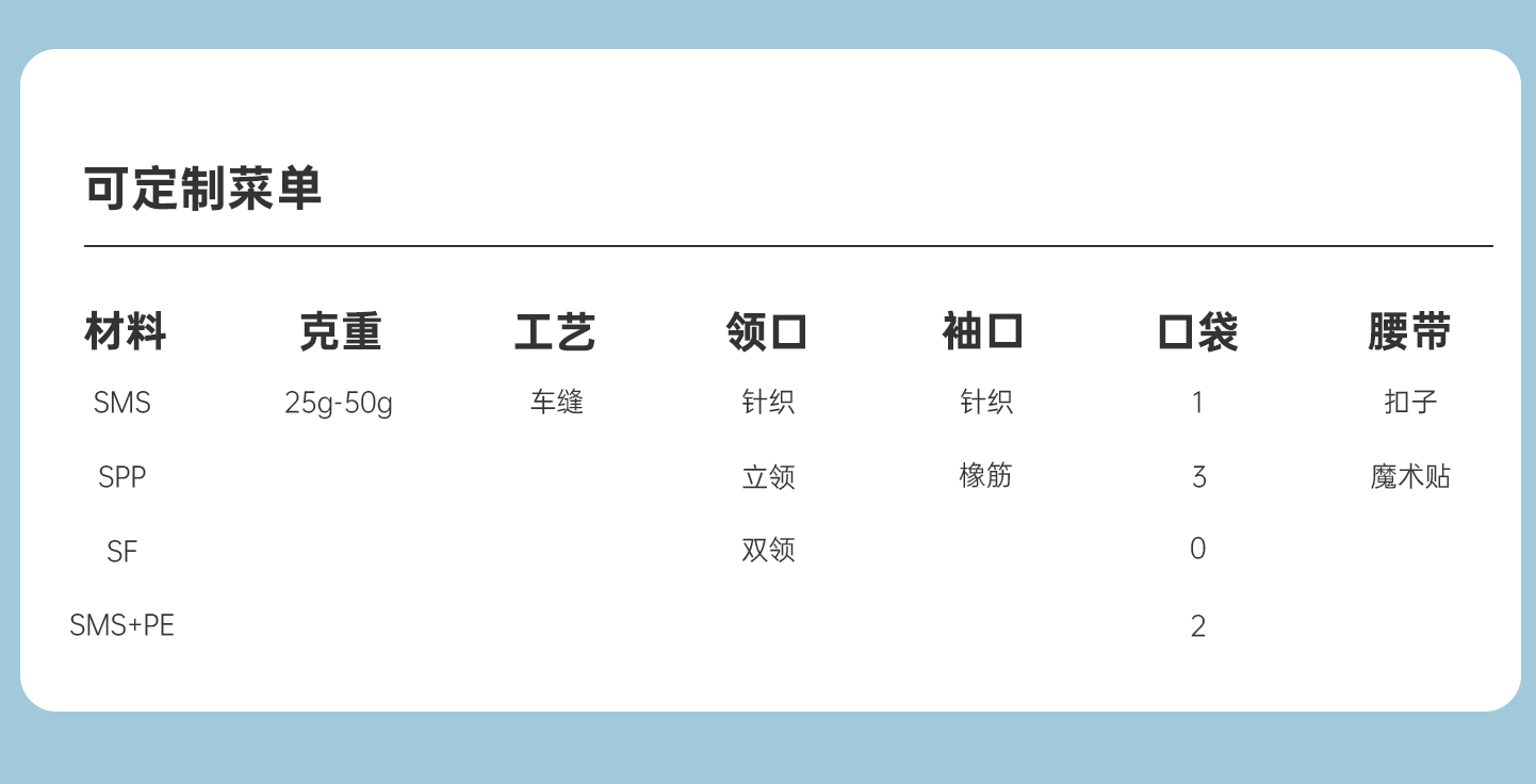規(guī)格尺寸:S~2XL 主要成分:聚丙烯 克重:25g-50g 顏色:白色、藍(lán)色、深藍(lán)、淺藍(lán)、紫色 工藝:車縫、針織領(lǐng)口、袖口、5扣、三口袋 包裝:10件/袋 10袋/箱