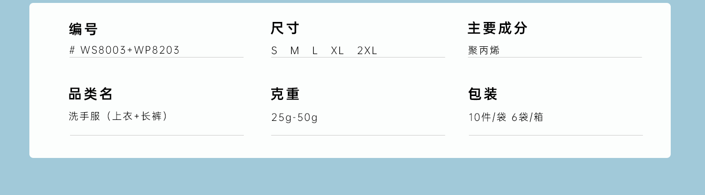 規(guī)格尺寸:S~2XL 主要成分:聚丙烯 克重:25g-50g 顏色:白色、藍(lán)色、深藍(lán)、淺藍(lán)、紫色 工藝:車(chē)縫、1口袋、圓領(lǐng) 包裝:10件/袋 6袋/箱