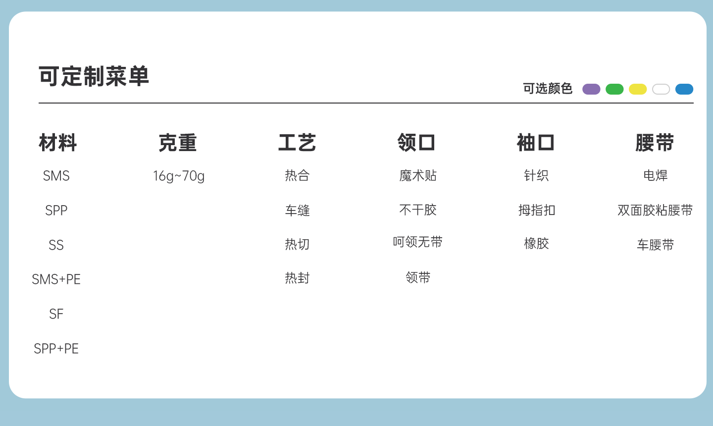 規(guī)格尺寸:S~2XL 主要成分:聚丙烯+聚乙烯 克重:43g 工藝:聚丙烯+聚乙烯 包裝:10件/包 5包/箱