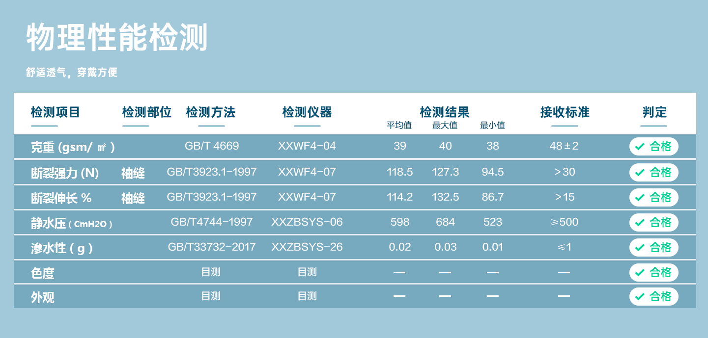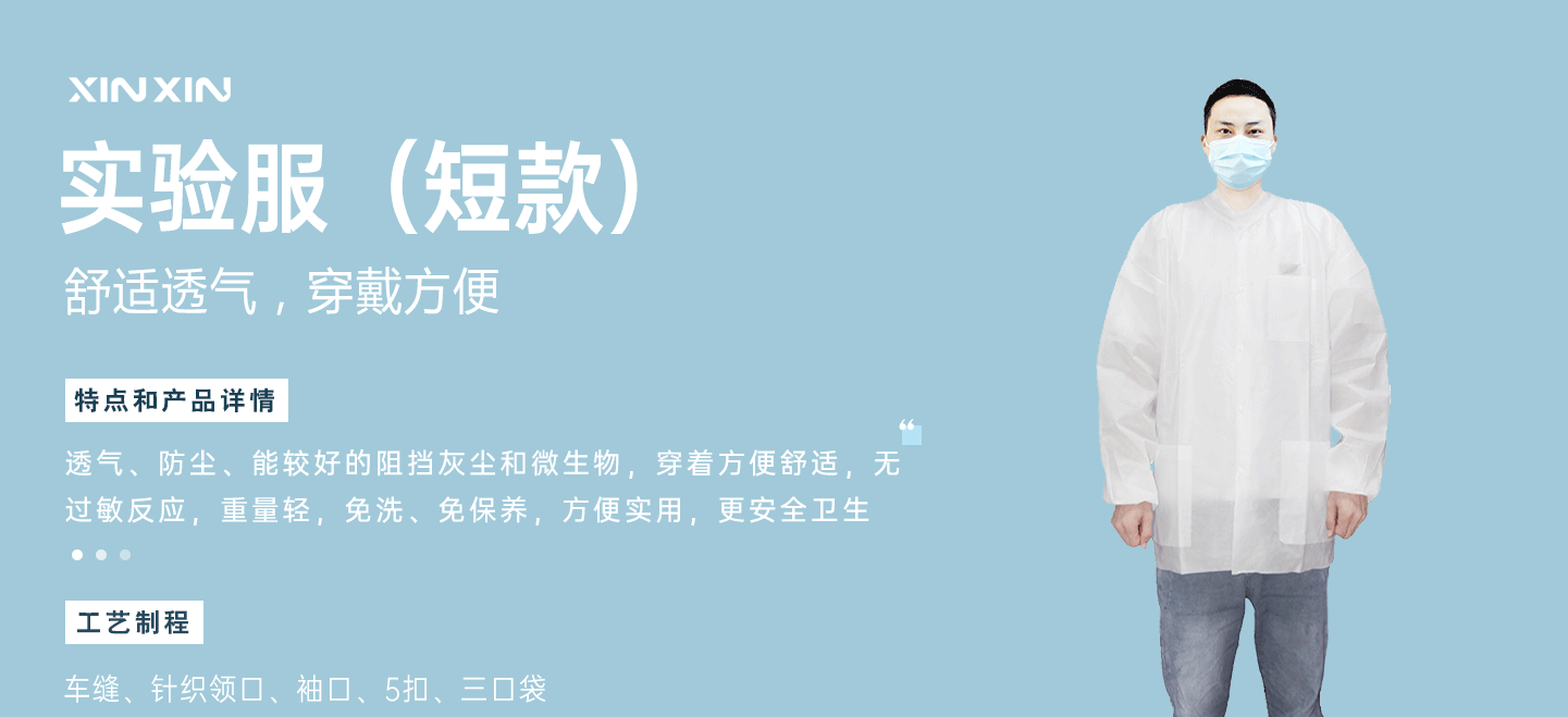 規(guī)格尺寸:S~2XL 主要成分:聚丙烯 克重:25g-50g 顏色:白色、藍(lán)色、深藍(lán)、淺藍(lán)、紫色 工藝:車縫、針織領(lǐng)口、袖口、5扣、三口袋 包裝:10件/袋 10袋/箱