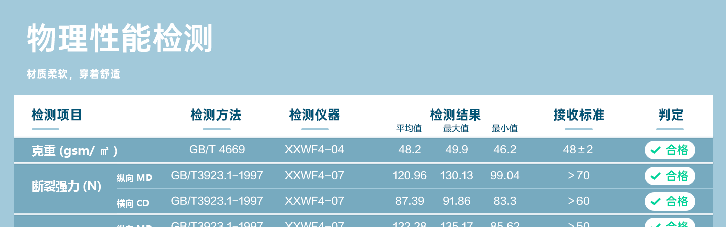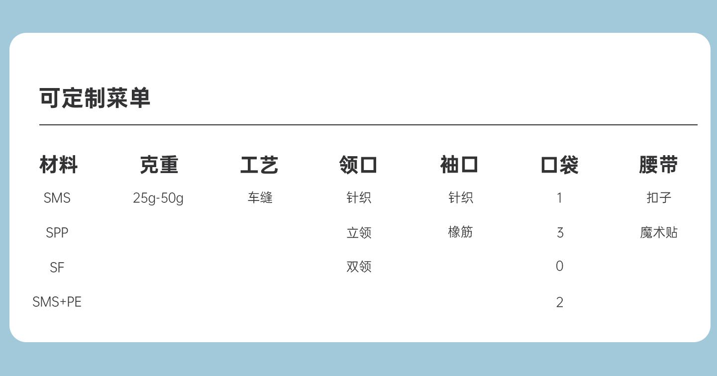 規(guī)格尺寸:S~2XL 主要成分:聚丙烯 克重:25g-50g 顏色:白色、藍(lán)色、深藍(lán)、淺藍(lán)、紫色 工藝:車(chē)縫、1口袋、圓領(lǐng) 包裝:10件/袋 6袋/箱